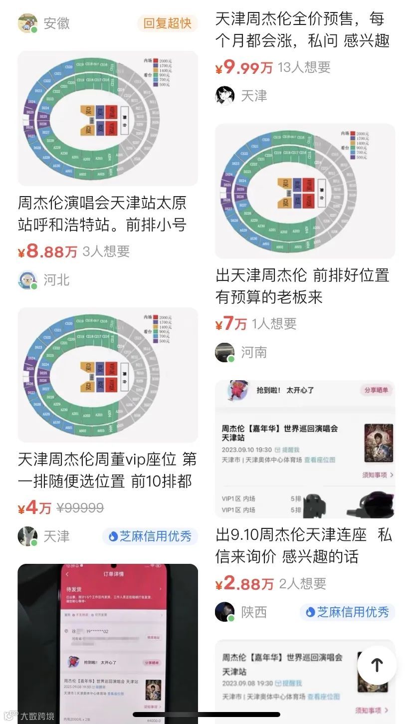 周杰伦的天津站演唱会未要求强制实名制抢票,抢票结束后,某二手平台上有很多关于这场演唱会的高价门票出售。两张购买价格2000元的连座演唱会门票,被标价了150000元。