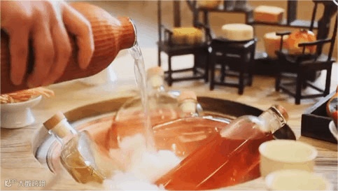 干冰(dry ice)作为“围炉冰茶”的必备道具,在干冰上倒热水或开水会迅速降温,营造出烟雾。