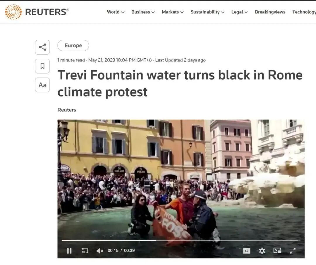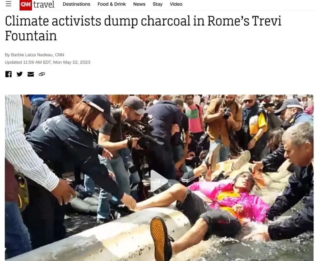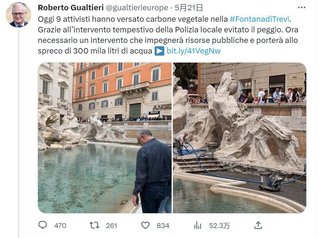 今年4月,他们在西班牙台阶(Spanish Steps)底部的破船喷泉(Barcaccia Fountain)倾倒了木炭。5月,他们又把矛头对准了纳沃纳广场的四河喷泉(Fountain of Four Rivers)。该环保组织声称对每起事件负责。