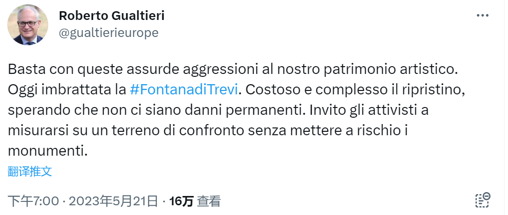Rome Mayor Roberto Gualtieri tweeted: “Enough of these absurd attacks on our artistic heritage. Today the #FontanadiTrevi was smeared. Expensive and complex to restore, hoping there is no permanent damage.”