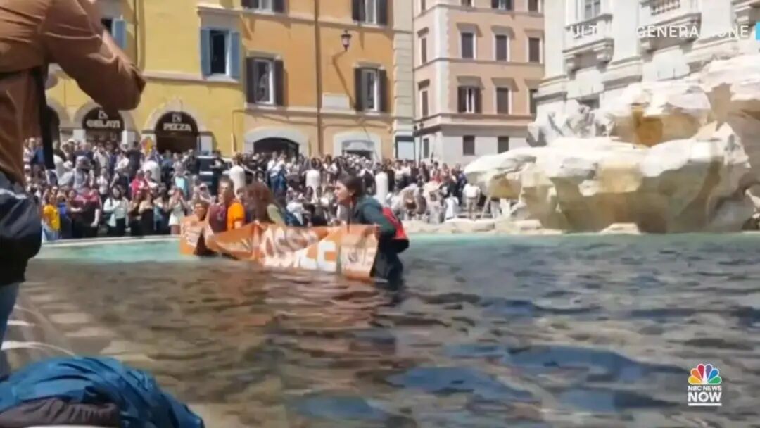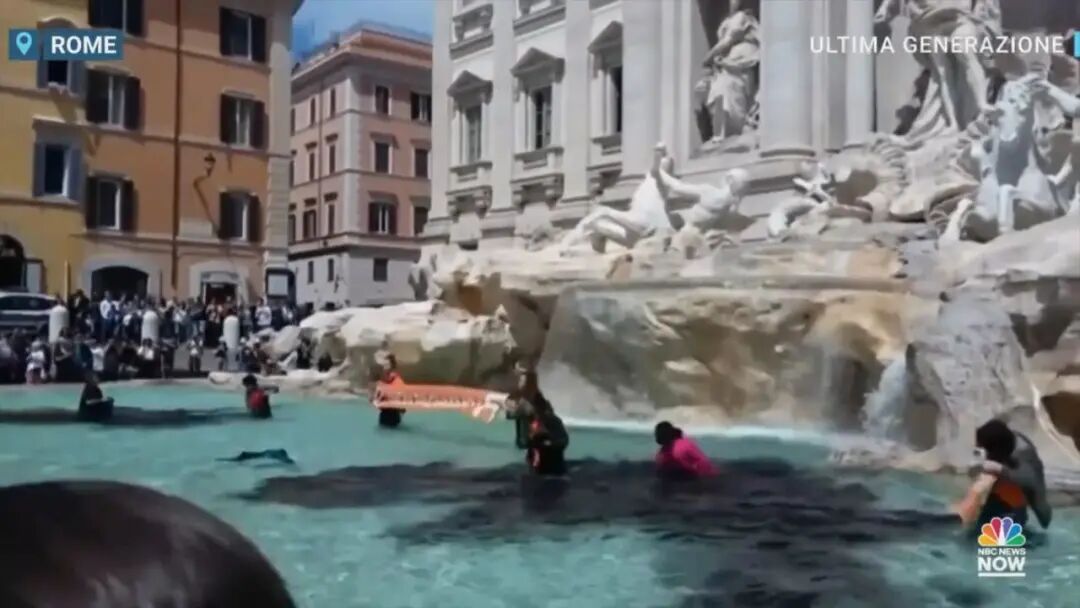 Around 10 activists from the climate group Ultima Generazione (Last Generation) entered the 18th century late-Baroque fountain holding a banner that said, “Let’s not pay for fossil campaigns considering what is happening in Emilia Romagna.”
