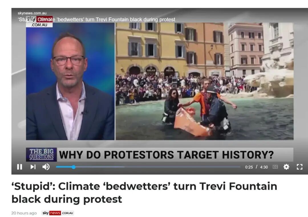 Sky News host James Macpherson says climate “bedwetters” have turned the water in Rome's Trevi Fountain black in an act of “senseless vandalism”. “How stupid must you be to think that the best way to prove you want a clean planet is by contaminating water,” Mr Macpherson said. “We fight pollution with pollution; it doesn’t even make sense.”