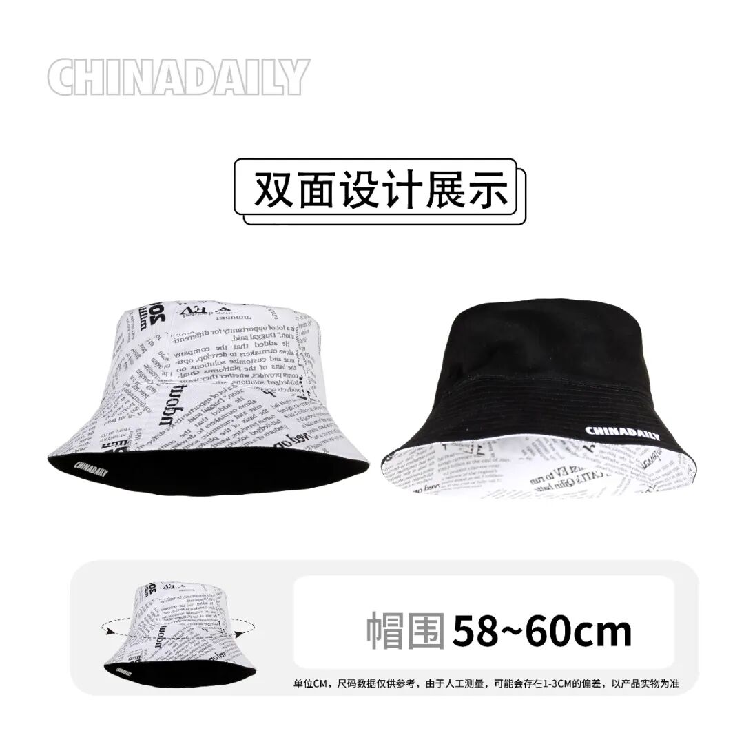 渔夫帽一面为中国日报报纸图样的拼接;另一面全黑百搭,精致logo点缀。格调高雅,品味不俗。