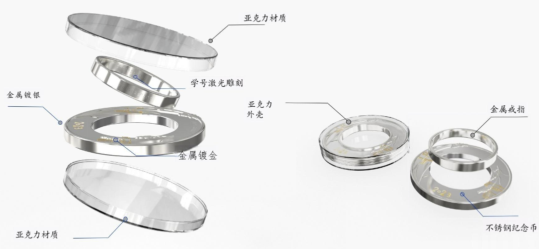 礼盒里有印章、纪念币/戒指等。币中央小巧的指环,镌刻着毕业年月,印章采用子母印的设计,代表着学校永远与毕业生们同在。