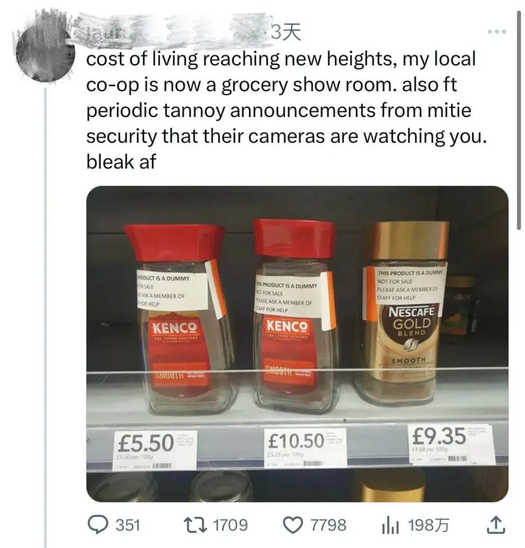 Another user posted a picture of "dummy" coffee jars on a shelf at Co-op, with customers told to ask at the counter if they want to buy the real thing.