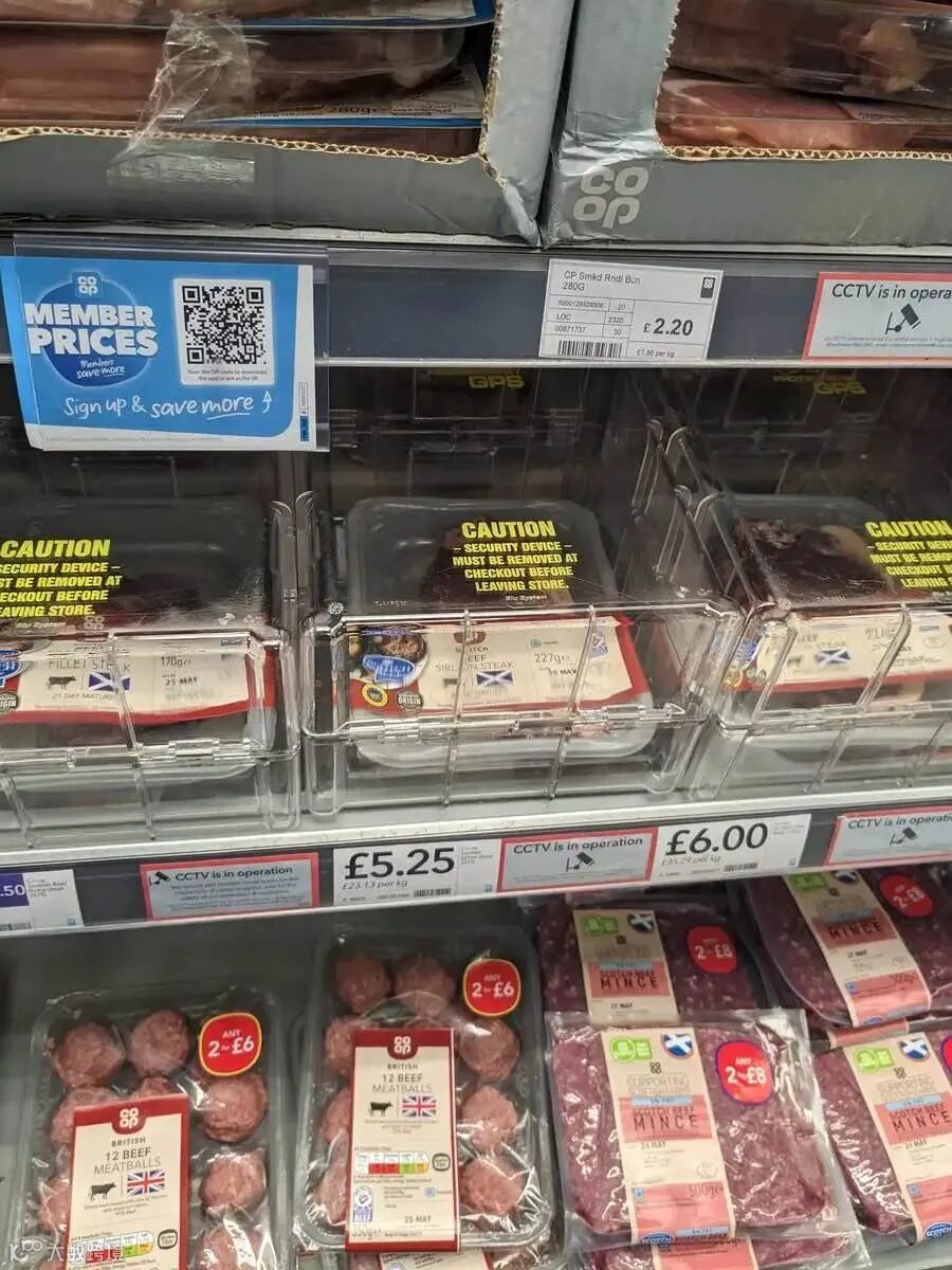 社交媒体上流传的照片显示了不同超市采取的各种反扒措施。一位用户发布的照片显示,在连锁超市Co-op,牛排被锁在全装置,配文称:"他们把牛排包装得像金条一样"。