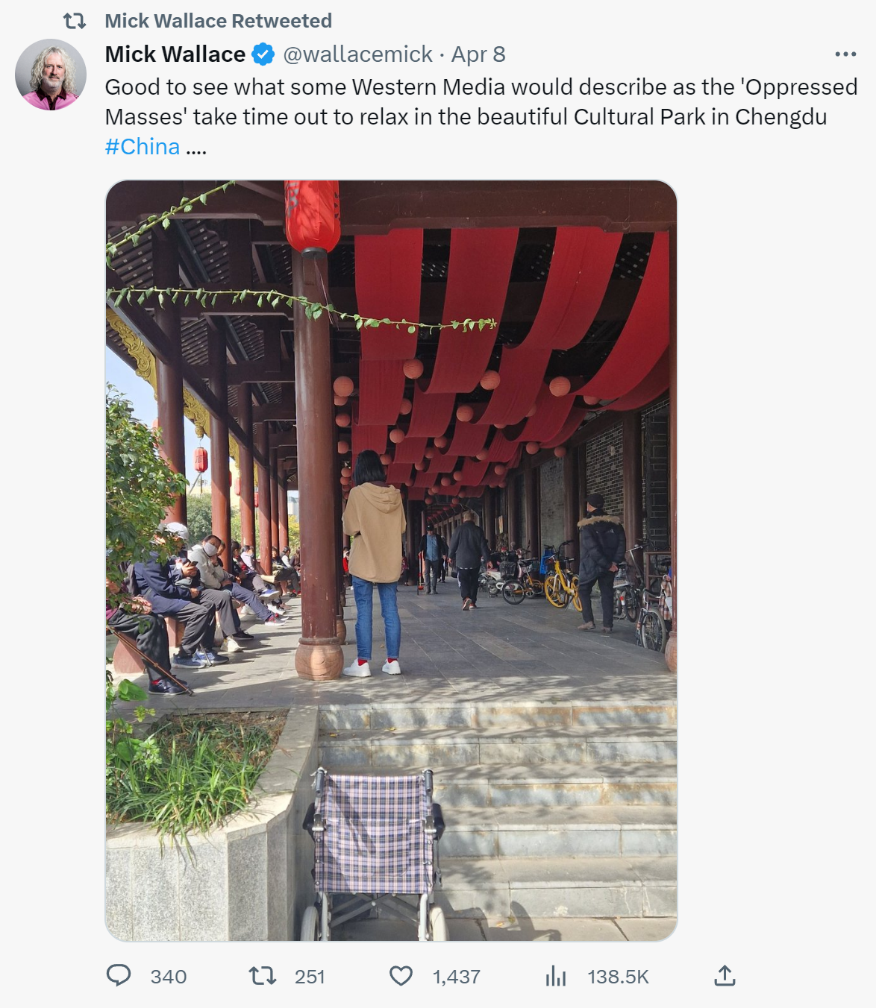 在成都时,他在社交媒体上晒图嘲讽了一把西方媒体——“很高兴看到一些西方媒体所描述的‘被压迫群众’在成都美丽的文化公园抽出时间放松身心。”