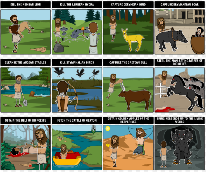 这些Herculean Labors包括,清理巨大的马厩、和狮子摔跤、捕捉大型野猪、偷盗金苹果等等。虽然中文大多将其翻译成“功业、伟业、考验”,但原文的含义其实是强调“辛苦、需要付出极大的努力”。