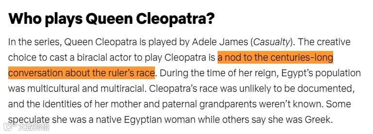 网飞公司(Netflix)的剧情式纪录片《埃及艳后》(Queen Cleopatra)将埃及托勒密王朝女王克利奥帕特拉七世(Queen Cleopatra VII)描绘成一个非洲黑人,这在埃及引发了争议。