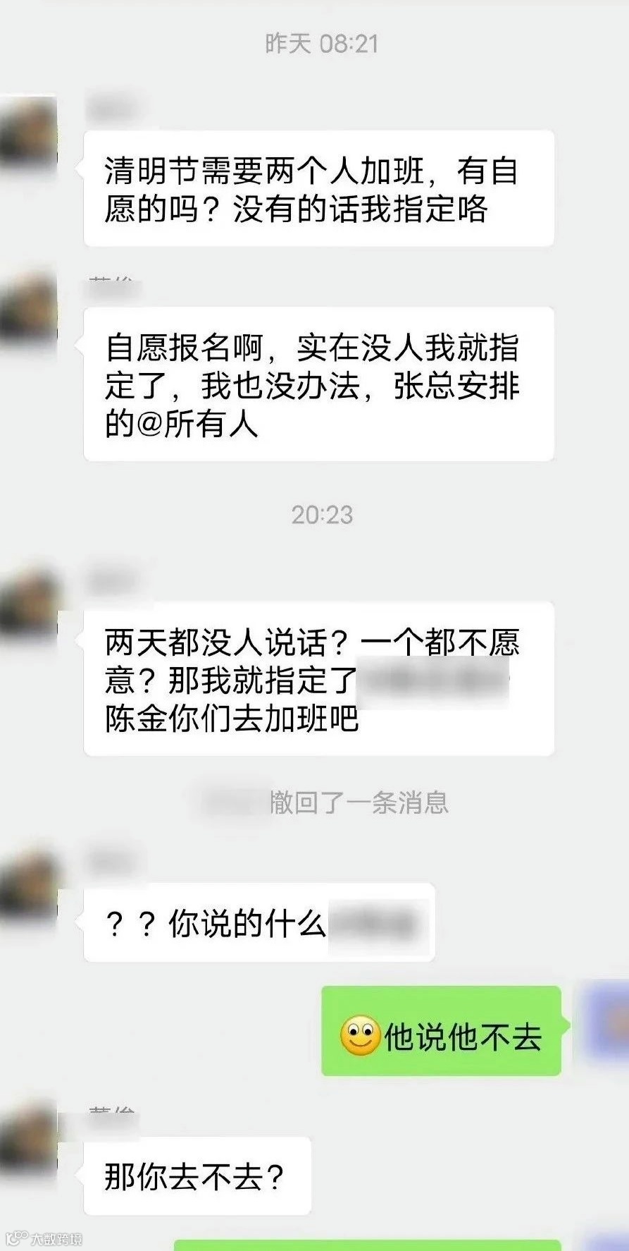 4月4日,“员工因清明节被强制加班怒怼领导”的聊天记录在网络上热传,迅速引起网友热议。