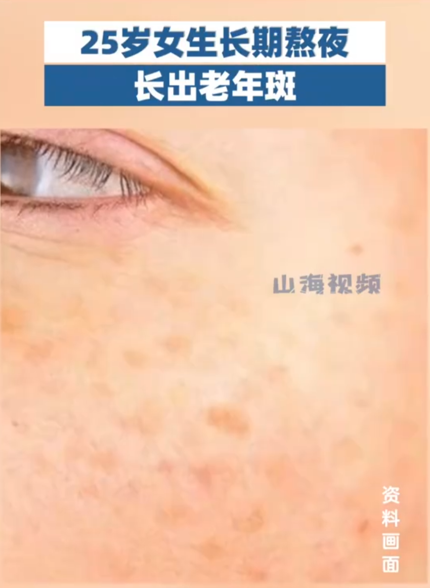 据山海视频报道,山东济南一名25岁的女生因长期熬夜长出老年斑。据山东大学齐鲁医院整形美容烧伤科副主任医师刘培介绍,当时女生来就诊时面部有了老年斑的色素沉着,了解得知女生很少12点之前入睡,因为长期的熬夜、睡眠不足长出了老年斑。
