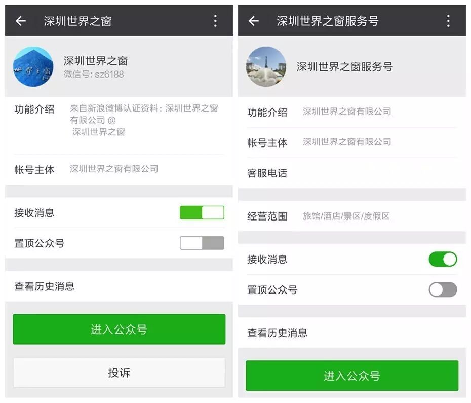 一、关注深圳世界之窗微信订阅号或服务号,点击“进入公众号”。