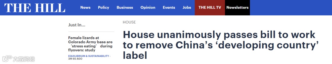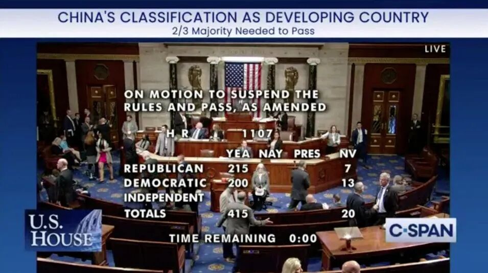 据美国《国会山报》报道,美国国会众议院于当地时间27日以415:0的全票结果,通过了一项旨在剥夺中国“发展中国家”地位的立法草案。