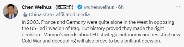 正如陈卫华在推文中所写:“2003年,法国和德国作为西方为数不多的两个国家,极力反对美国发动伊拉克战争。历史证明,他们做出了正确的决定。马克龙关于欧盟战略自主、抵制新冷战和脱钩的言论也将被证明是一个明智的决定。”