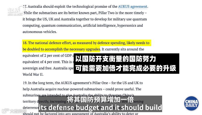 文章开头提到的澳媒报道称,战争虽是虚的,但“专家”们建议澳洲备战的准备可是要来真的了。这些“专家”建议,澳大利亚应该将其国防预算增加一倍,并在美国的帮助下,建立起核武器武装以巩固国防,甚至应该重新实行征兵制度。