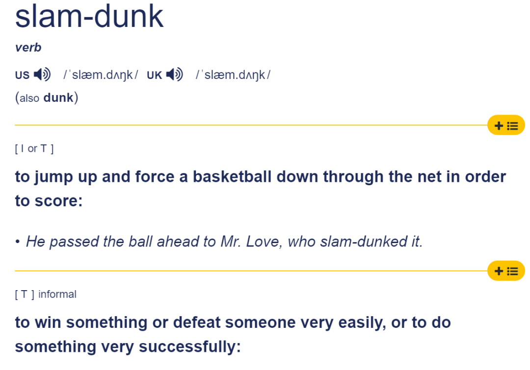 后来,slam dunk这一短语也被应用于商业环境中,表示轻而易举可以做到的事。一起看例句: