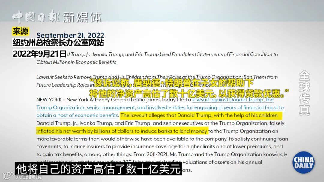 纽约州总检察长利蒂希娅·詹姆斯指控特朗普将自己的资产高估了数十亿美元,好从银行获得更低的贷款利率。詹姆斯要求这位前总统偿还高达2.5亿美元的不当得利。如果纽约州在审判中获胜,特朗普和他的子女将被永久禁止在任何纽约公司担任高管或董事。