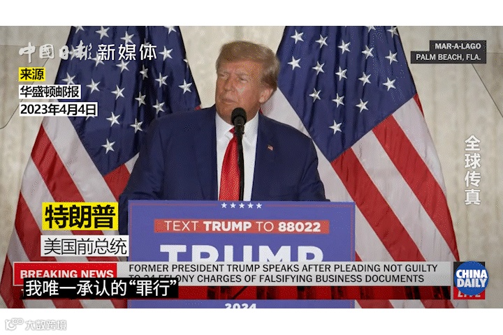 当地时间2023年4月4日晚,美国前总统特朗普在纽约曼哈顿出庭后,回到佛罗里达州的海湖庄园,并发表讲话。