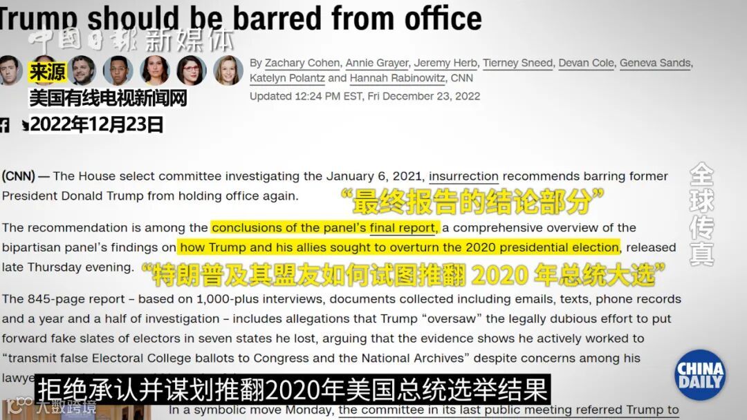 2021年1月6日下午,国会认证选举结果期间,大批特朗普支持者暴力闯入国会大厦酿成骚乱,造成人员伤亡。2022年12月22日晚,美国众议院特别调查委员会发布了关于该事件的最终报告。报告指控特朗普谋划推翻2020年美国总统选举结果,并建议禁止特朗普担任公职。