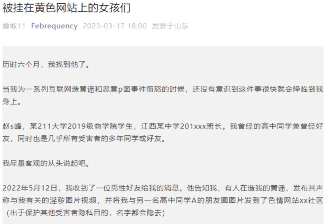 In the article, the anonymous author gave details of the case. It stated that last May, a friend informed her someone had concocted rumors of a pornographic nature about her and uploaded photos of her and another female classmate that they had posted in their WeChat albums, to a porn forum.