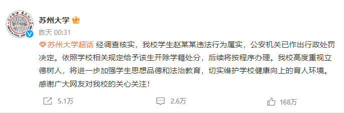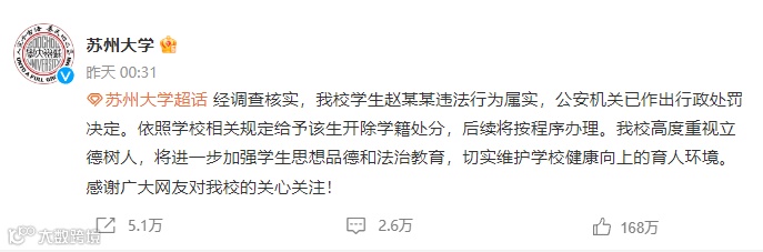 苏州大学称,经调查核实,我校学生赵某某违法行为属实,公安机关已作出行政处罚决定。依照学校相关规定给予该生开除学籍处分,后续将按程序办理。我校高度重视立德树人,将进一步加强学生思想品德和法治教育,切实维护学校健康向上的育人环境。感谢广大网友对我校的关心关注!