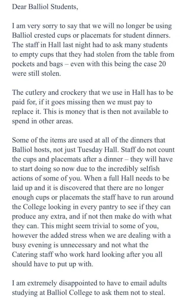 "I am very sorry to say that we will no longer be using Balliol crested cups or placemats for students."