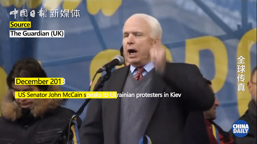 2013年12月,美国参议员约翰·麦凯恩在基辅向乌克兰抗议者发表讲话。他说: