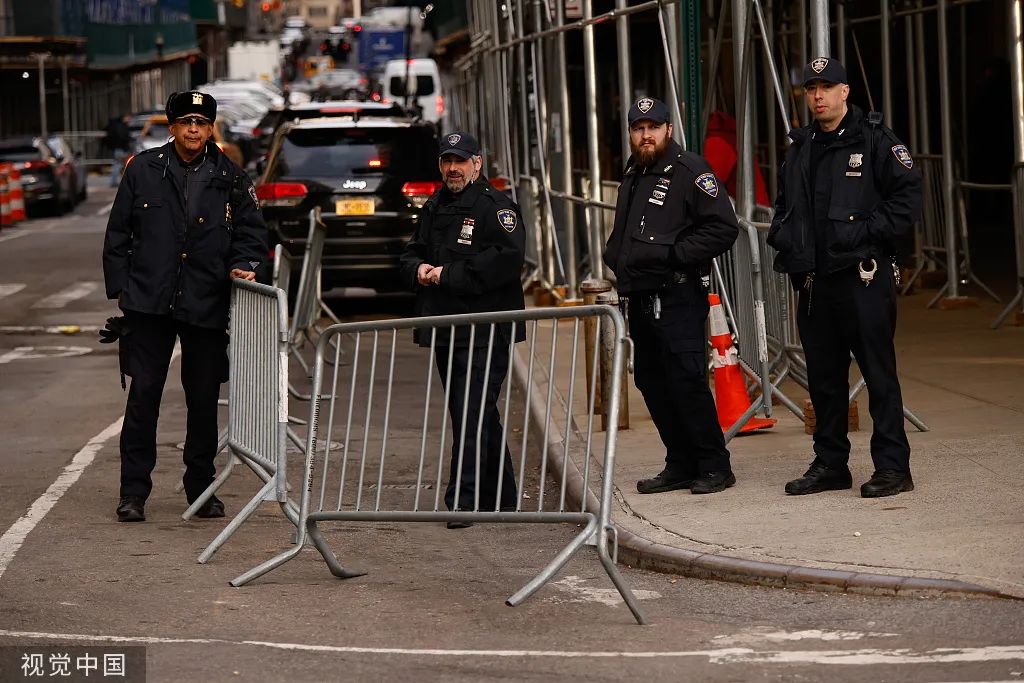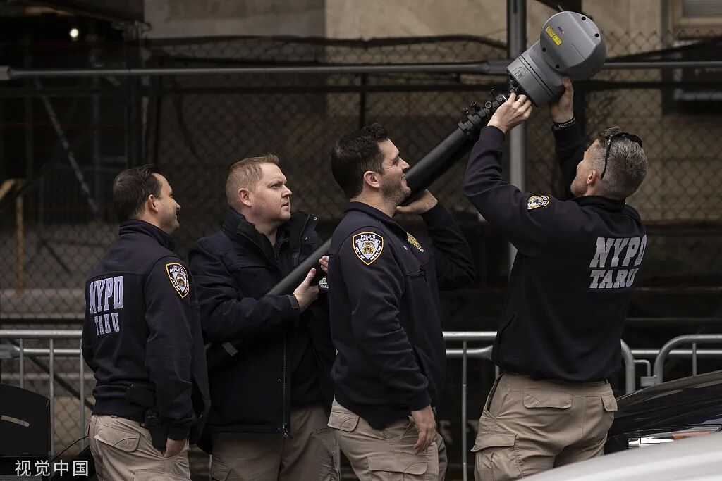 当地时间2023年3月31日,美国纽约,警方在曼哈顿刑事法院外设置了监控摄像头。