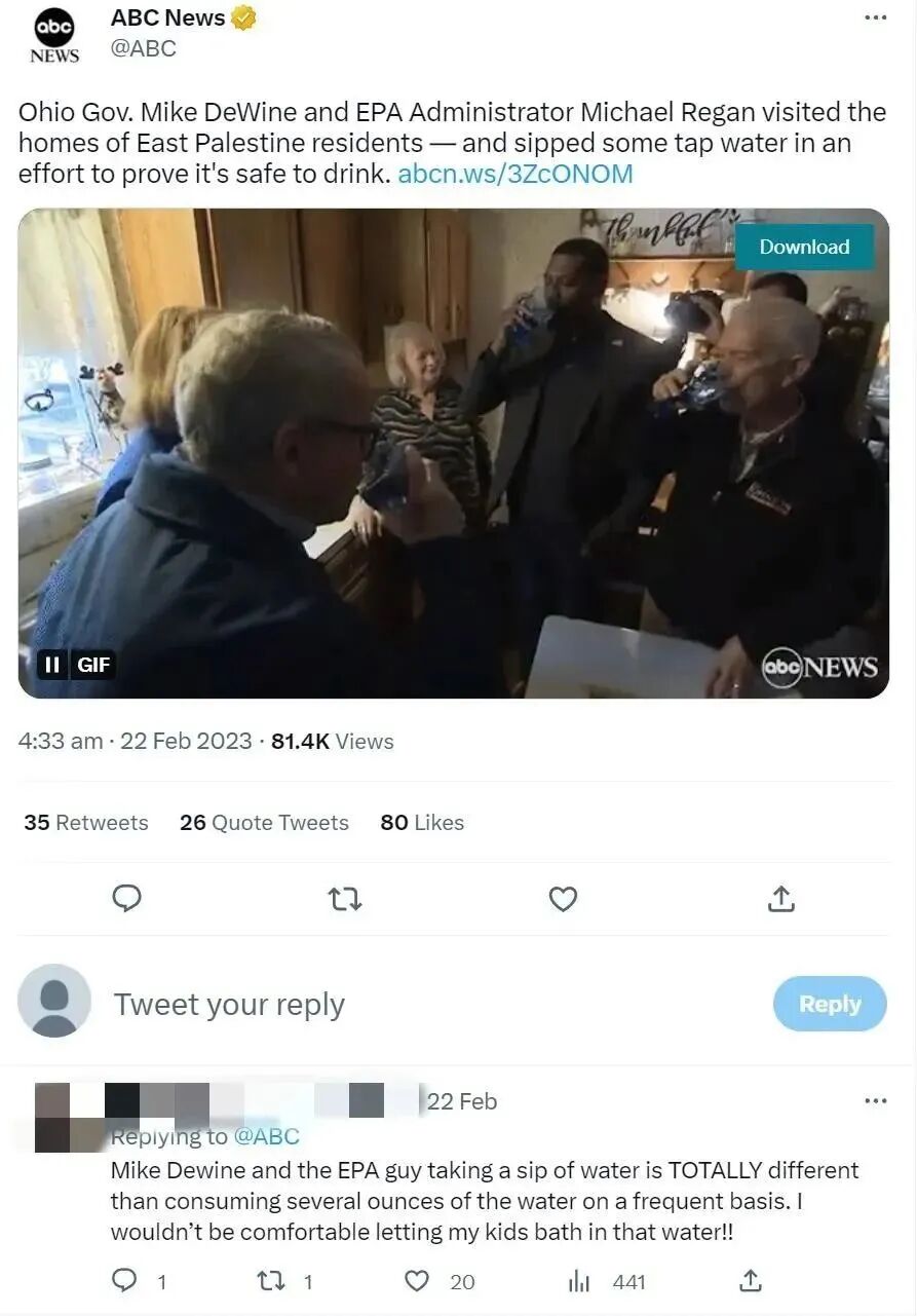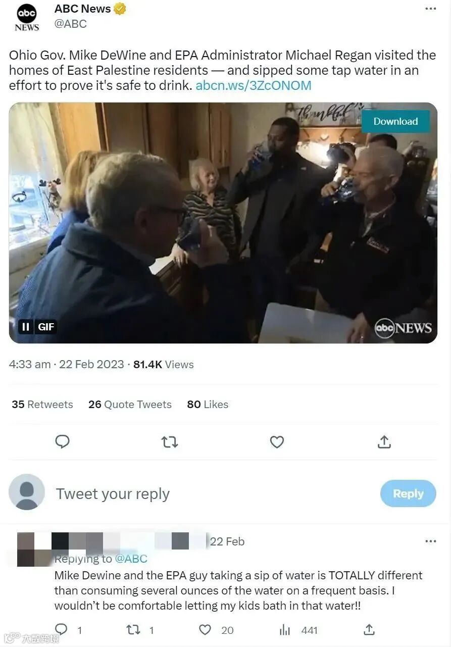 当地时间21日,美国俄亥俄州州长麦克·德瓦恩(Mike DeWing)美国环境保护局局长迈克尔·里根(Michael Regan)前往东巴勒斯坦一名妇女家中,并与当地官员等人一同饮用了居民家中的自来水,在镜头前上演“当众喝水”,以证明事故过后当地的水源仍然是安全的。