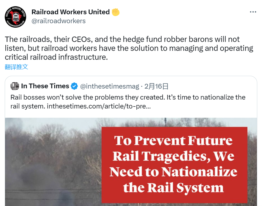 这起火车脱轨事故是整个美国铁路系统“唯利是图”的一个缩影,是系统性问题,体制性问题。
