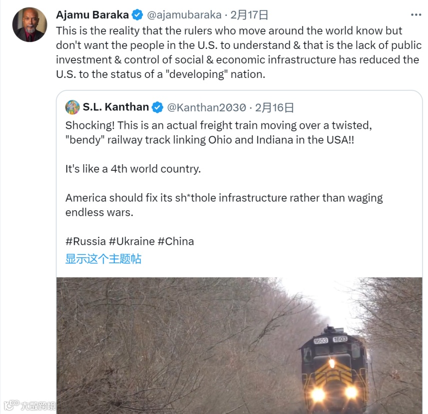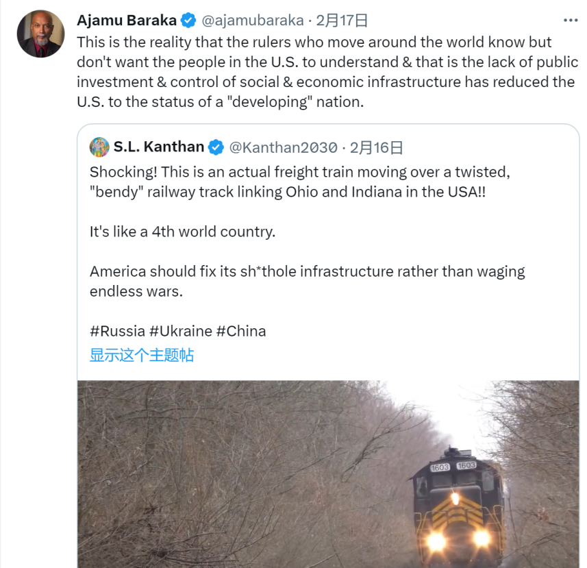 美国人权活动家、政治分析家Ajamu Baraka就俄亥俄州火车脱轨事故发声:“这是所有掌权者都知道,但不希望让美国人民明白的现实:缺乏公共投资和对社会经济基础设施的控制,已经让美国沦落到‘发展中’国家的地位。”