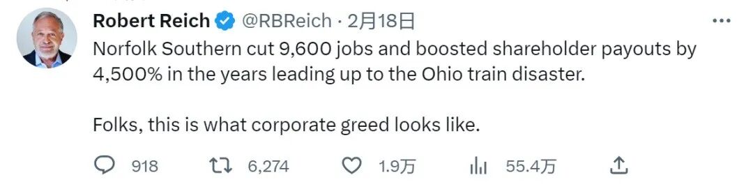 加州大学伯克利分校公共政策教授、克林顿政府时期的美国劳工部长Robert Reich发推指责此种行为,称其为“企业贪婪的嘴脸”。他指出,俄亥俄州列车脱轨事故发生的前几年里,诺福克南方铁路公司裁员9600人,股东分红提高了4500%。