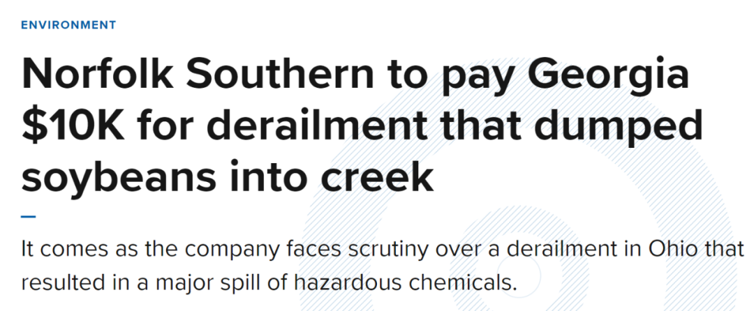 疯狂敛财是根本,民众安全被抛之脑后。据美媒2月13日报道,美国佐治亚州开出的“罚单”显示,诺福克南方公司需为去年7月在霍尔县发生的火车脱轨事故向佐治亚州支付1万美元,原因是火车脱轨导致的大豆腐烂造成大量野生动物死亡。