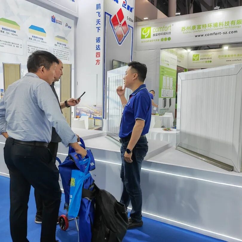 此次博览会四方科技以PIR B1级聚氨酯保温板为主推产品,团队携带节能板材样品亮相展会,高品质的板材引起客户的关注,相较于畜牧业常用的玻璃丝绵,聚氨酯节能板材外形美观,其优异的保温性能和较轻的容重也引起客户的兴趣。