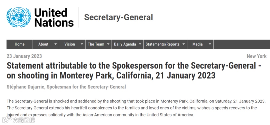 当地时间1月23日,联合国秘书长古特雷斯通过发言人发表声明,对22日在美国加利福尼亚州蒙特雷帕克市发生的枪击事件感到震惊和悲伤。古特雷斯在声明中,向受害者家属和亲人表示哀悼,并祝愿伤员早日康复。