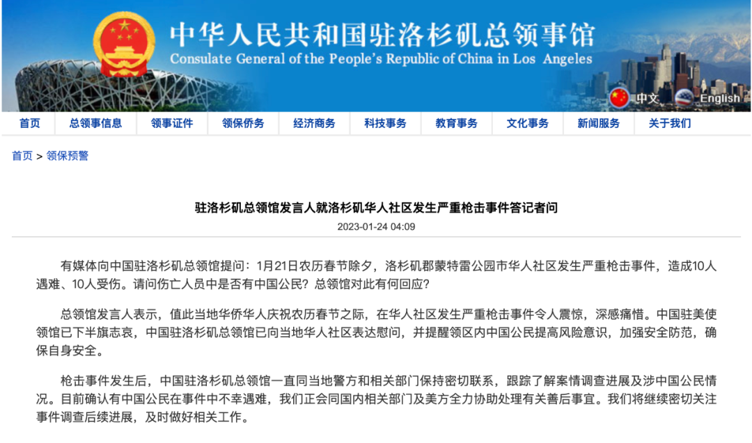 中国驻洛杉矶总领馆发言人1月24日凌晨就洛杉矶华人社区发生严重枪击事件答记者问时确认,有中国公民在事件中不幸遇难,总领馆正会同国内相关部门及美方全力协助处理有关善后事宜。