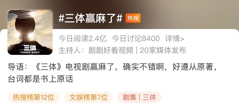由杨磊执导的《三体》电视剧历时四年打磨剧本,2020年开拍,历经126天拍摄。无论是中国知名科幻IP的加持,还是张鲁一、于和伟、陈瑾、王子文、林永健、李小冉组建的主演阵容,均给该剧的热度加了一把火。