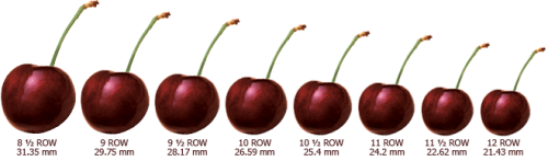 目前,美国和加拿大等北半球国家以“Row”(俗称“行号”)为标准对车厘子进行分级。行号越小,车厘子越大;车厘子的大小多在8号行和12号行之间变化。