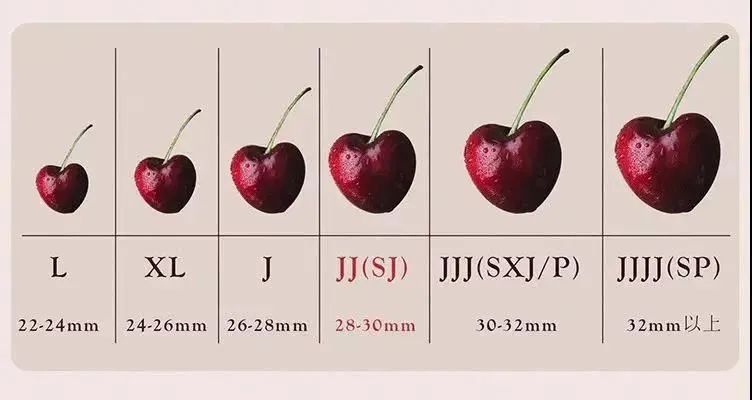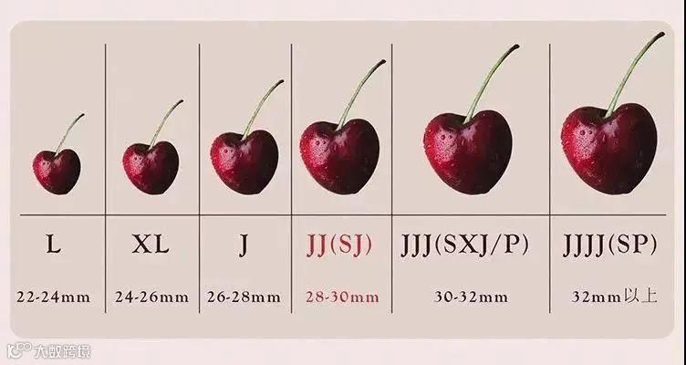 从大小看,常见的车厘子主要分为“L、XL、J、JJ、JJJ、JJJJ”几个级别,“J”(Jumbo)是车厘子的分级常用单位,“J”的数字越多,代表樱桃的个头越大,其单价也会更贵。