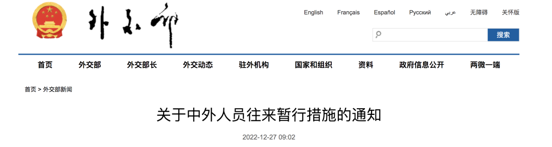 12月27日,国务院应对新型冠状病毒感染疫情联防联控机制外事组发布《关于中外人员往来暂行措施的通知》。