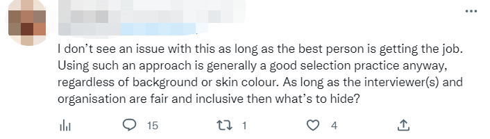 “只要是合适的人得到这份工作,我不认为这有什么问题。无论背景或肤色如何,使用这种方法通常是一种良好的选择做法。只要面试官和组织是公平和包容的,那么有什么可隐瞒的呢?”