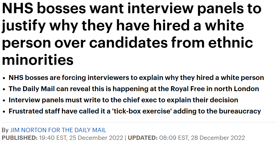 A senior source at the hospital said: 'It feels like a tick-box exercise. When we discuss who the best applicant was after the interview, it’s not about their ethnicity……So justifying your decision based on where they might be from does take a lot of time because you have to revaluate your decision from a completely different perspective, based on race rather than ability.'