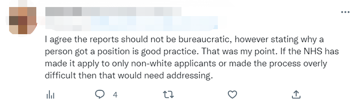 “我同意报告不应该是官僚主义的,然而我认同说明一个人为什么得到一个职位是好的做法。这就是我的观点。但是如果国家卫生系统只对非白人申请者适用,或者使录用过程过于困难,那么这就存在问题。”