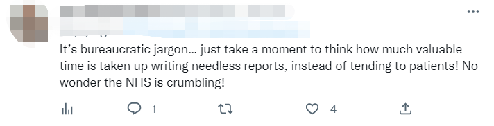 “这是官僚主义的行话......只要花点时间想一想,有多少宝贵的时间被用来写不必要的报告,而不是去照顾病人!这就是为什么NHS正在崩溃。难怪国家医疗服务系统正在崩溃!”