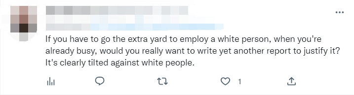 “如果你不得不在已经很忙的情况下,再去雇佣一个白人,你真的想再写一份报告来证明这一点吗?这显然是对白人的反向歧视。”