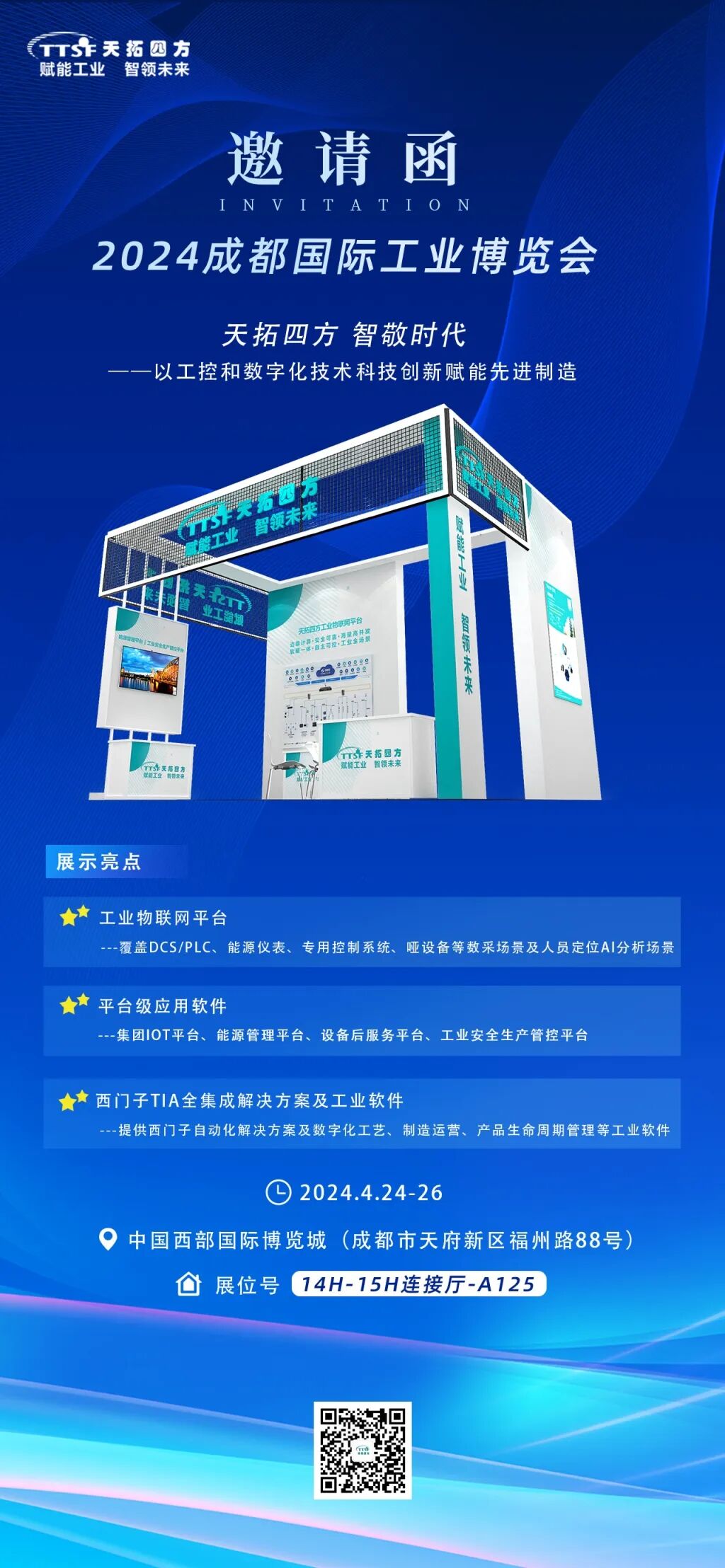 天拓四方将携工业物联网平台、平台级应用软件、西门子TIA全集成解决方案及工业软件亮相2024成都国际工业博览会(展位号:14H-15H连接厅A125)。在此,我们诚挚地邀请您莅临展会现场,见证行业盛会!