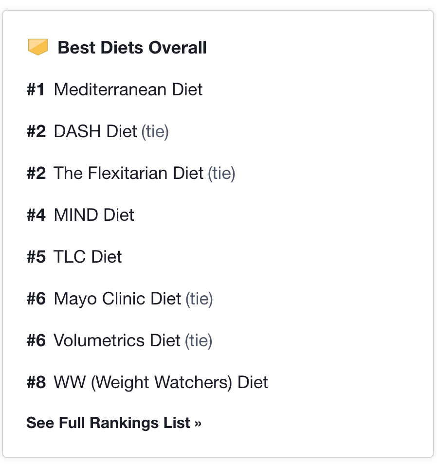 除此之外,地中海饮食法在“最佳健康饮食法(best diet for healthy eating)”和“最佳植物性饮食法(best plant-based diet)”类别中也排名第一。