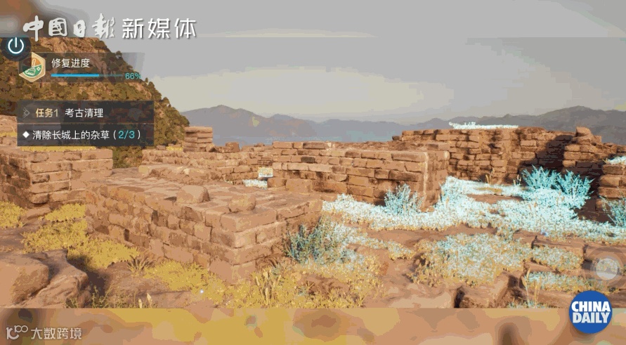 通过这种方式,我们一方面可以在线一睹长城在一天中不同时刻的壮丽风貌:日出、正午、星空夜景,还能够通过交互式游戏,完成数字长城的“清除杂草”、“砌筑破损台阶”、为墙面“勾缝”、“修理整齐砖块”等修缮任务。