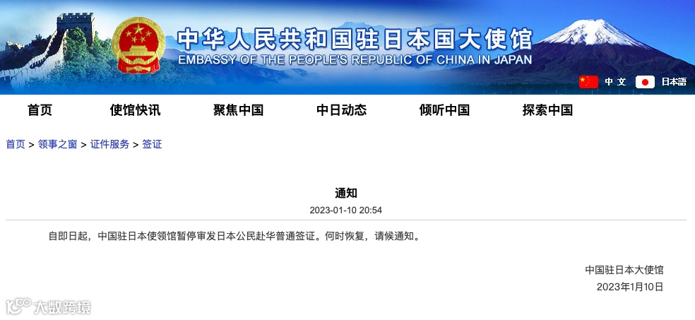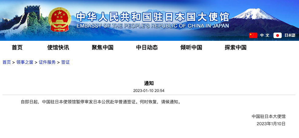 The Chinese embassy in Tokyo announced Tuesday that it had suspended processing and issuing regular visas for Japanese citizens to visit China. The suspension took effect on Tuesday, and it has not been announced when the services would resume, the embassy said in a statement.