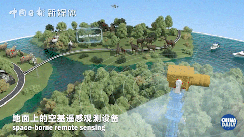 For key areas of environmental protection, such as rare animal habitats, space-borne remote sensing observation equipment functions as a telescope high above the ground. It can zoom in on an area of concern through a 360-degree scan every eight minutes to an hour. Then, field observation equipment can further identify the data.